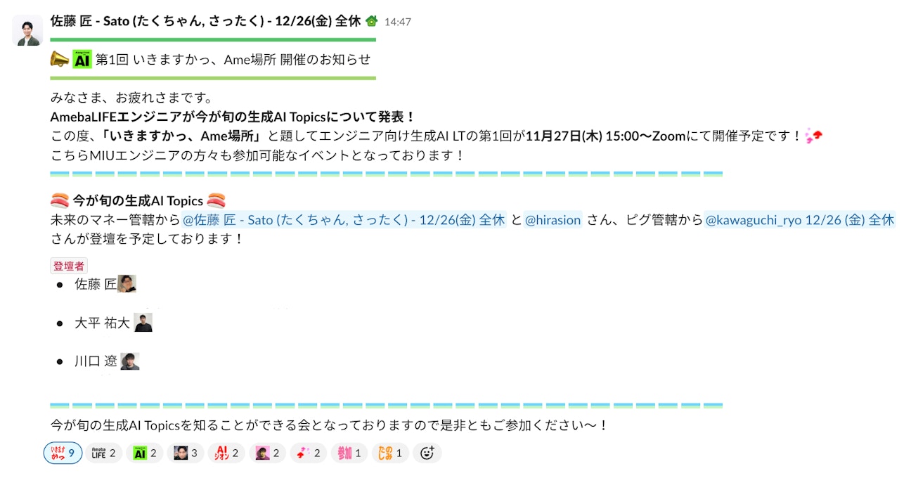先日、AmebaLIFEのエンジニア有志による生成AIナレッジ共有会、その名も「いきますかっ Ame場所」が開催されました。