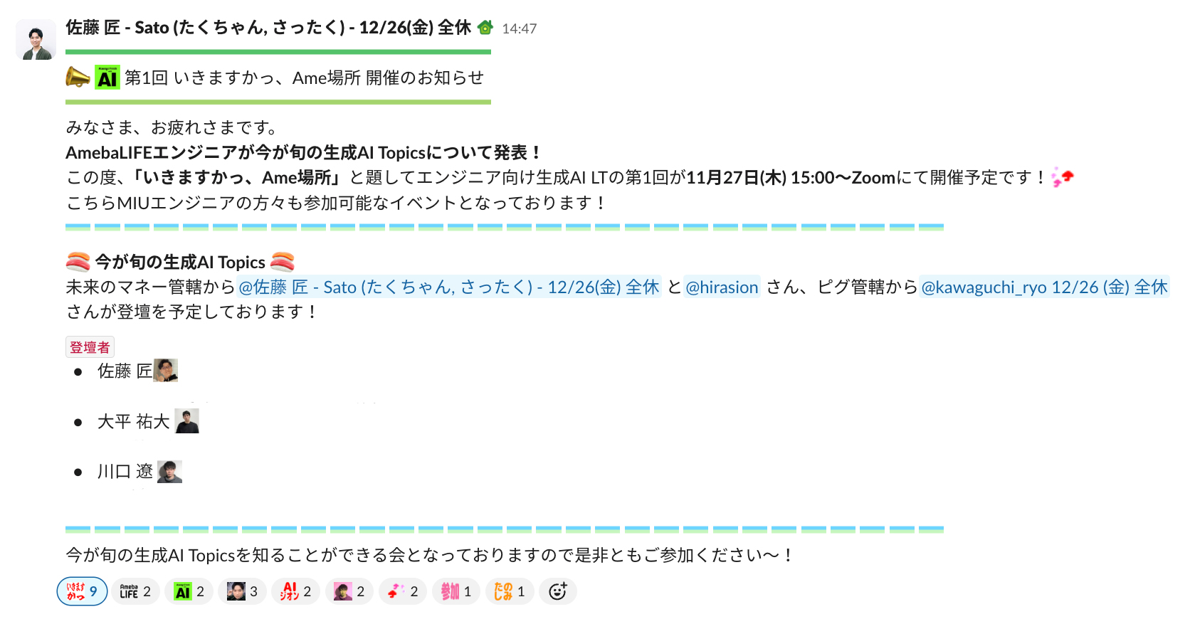 なぜ「Ame場所」かというと、全社で実施されている「エンジニア版AI番付」というAI活用の評価制度にかけて、この共有会を本場所と見立てたネーミングなんです。