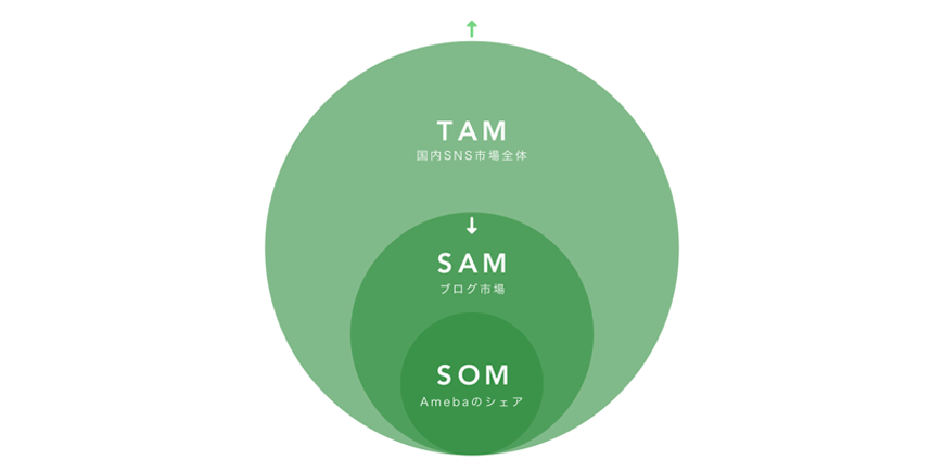 ①SNSにまつわる周辺の市場、②Amebaの現状メインのブログ市場、③Amebaのシェアの3つで考えると