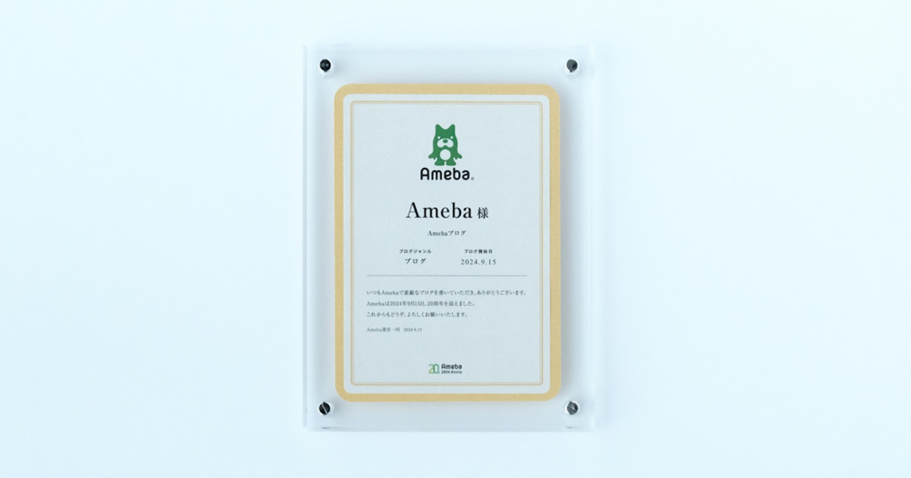 いただいた盾(メモリアルカード)を見て、ブログを初めて書いたときを思い出しました。私の子育ては常にブログと共にあり、思い出もそのときの気持ちもほぼ全てブログにつづってきたので、自分にとっては本当に大切な財産となっています。いつもありがとうございます。改めて20周年おめでとうございます。